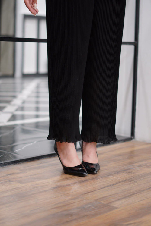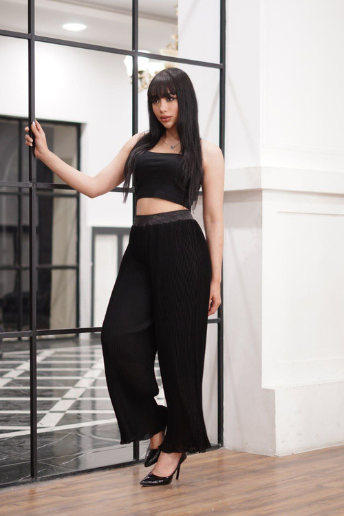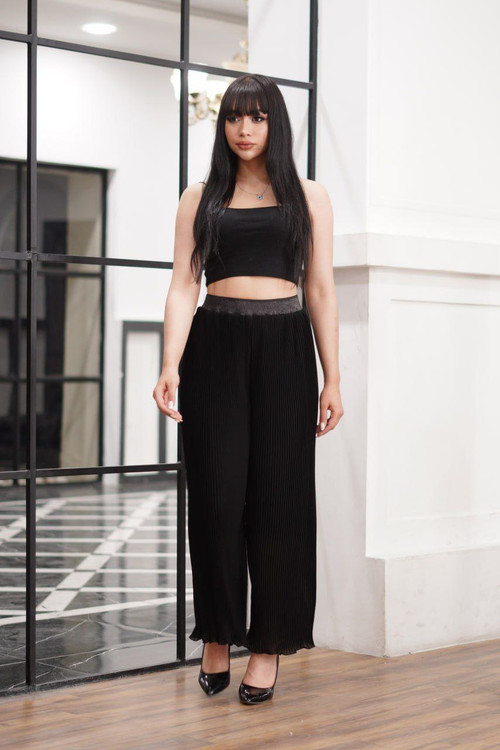 شلوار پلیسه کرپ حریر مجلسی ترک فری سایز مناسب مجلس های شما این شلوار با دارا بودن آستر این کار،رو شیک ترین و خاص تر کرده تک رنگ مشکی بودن باعث شده با بتونید راحت تر اینکار رو لا لباس های مجلسی تون ست کنید
