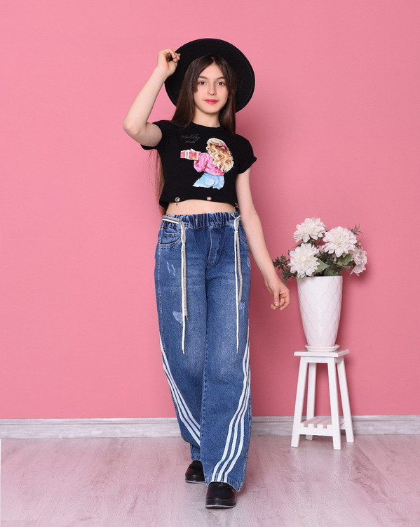 شلوار جین بگ سه خط اسپرتیه کار اسپرت که برای خردسالان و نوجوانان دارای سایزبندی میباشد