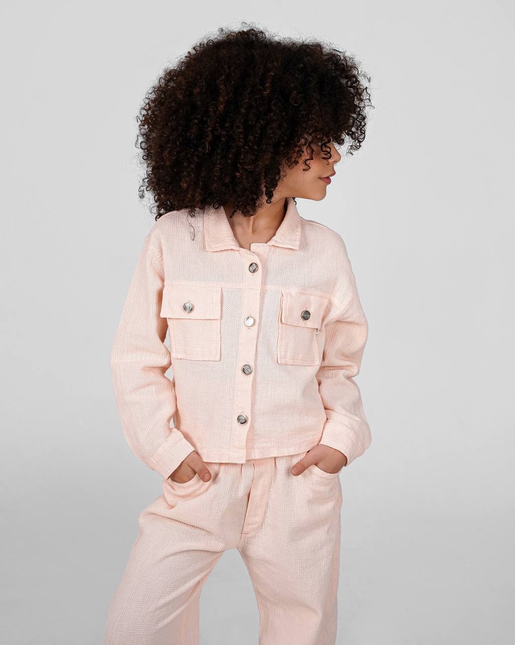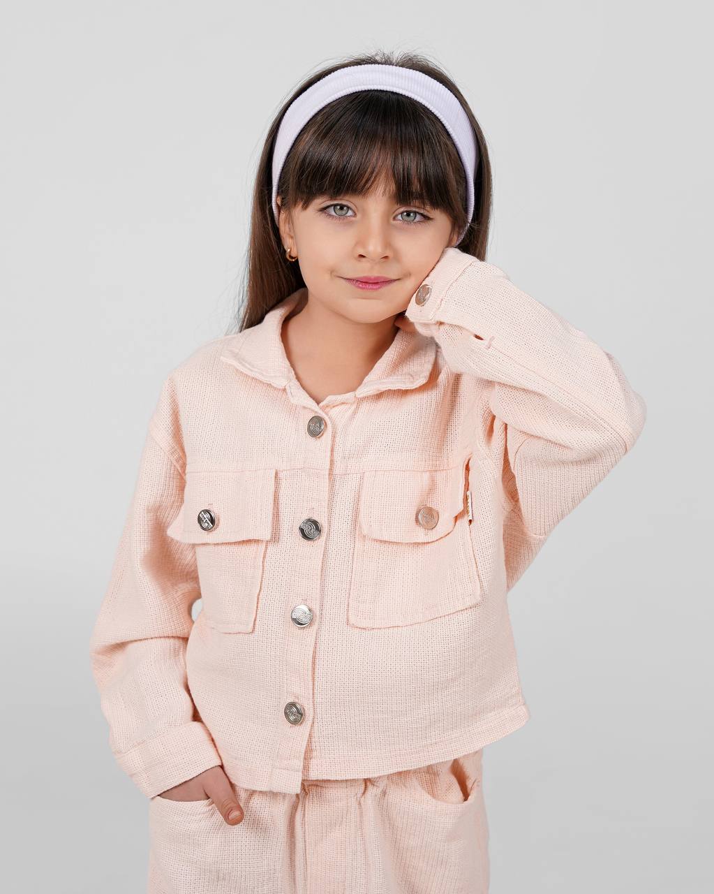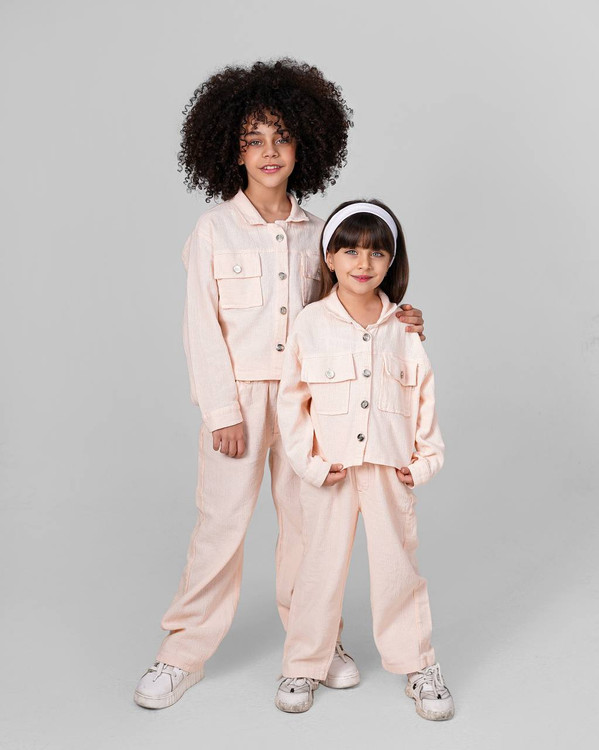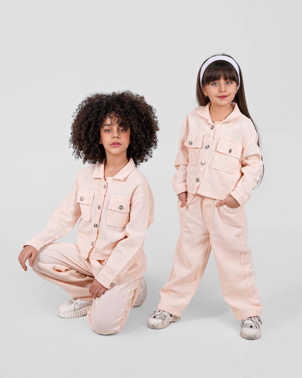 شومیز و شلوار کراپ کنفی گرم بالا مخصوص فصل سرد در دو رنگ کرم و صورتی کمرنک با کیفیت بالا بدون رنگدهی و ابرفت مناسب سن ۴ تا ۹ سال